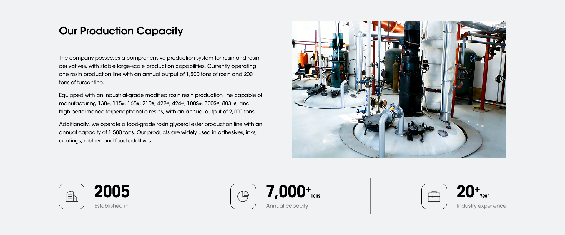 What is your annual production capacity?Our annual capacity includes approximately 1,500 tons of rosin, 200 tons of turpentine oil, 2,000 tons of modified rosin resins, and 1,500 tons of food-grade glycerol ester of rosin.